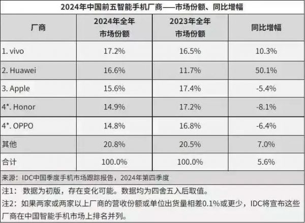 去年,苹果逆势增长,vivo结束此前高光时刻,荣耀三季度回归前五,但全年看,荣耀从2024年的第四名代替了小米,沦为IDC榜单上的others,小米成为第四名。