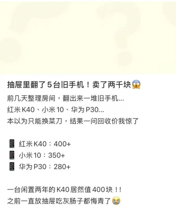 种草平台小红书上也有不少网友晒出自己在实体回收店评估旧手机的报价情况,比如红米 K40 报价 400+,但实际上这款机在电商平台的二手价格也基本是 400多元,也就是回收与二手售价几乎持平的状态。而一些大内存手机则非常吃香,比如红魔的一款 24GB+1TB 的手机,即便勾选了机身损坏、手机无法开机,也能勉强报价上到 1900+ 元。