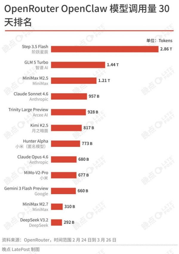 晚点:刚才你也提到了 OpenClaw 和中国开源模型的结合。在 OpenRouter(大模型接口聚合平台)上能看到 Token 消耗量最多的主要是中国模型,比如阶跃、MiniMax、Kimi、智谱,还有小米的新模型,都上榜了。
