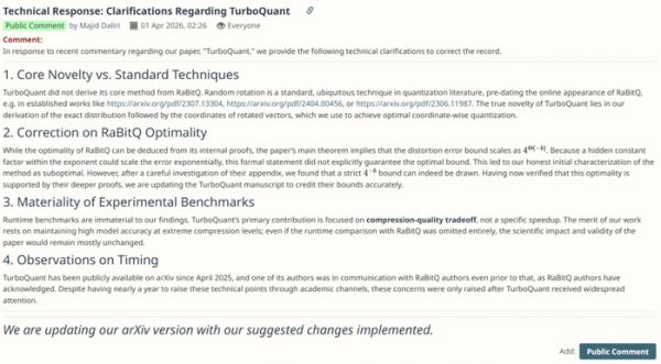 随着舆论发酵,TurboQuant 的作者团队在 OpenReview 平台上做出了公开回应,第二作者 Majid Daliri 发布了一份分为四点的「技术澄清」。