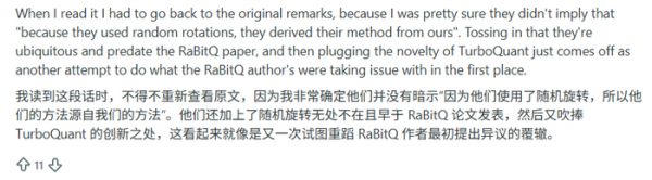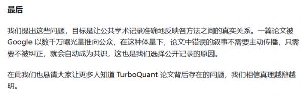 4、关于时间节点的说明TurboQuant 自 2025 年 4 月起已在 arXiv 上公开发布,其作者之一在此之前就已与 RaBitQ 作者进行过沟通(这一点也已被 RaBitQ 作者承认)。尽管对方有将近一年的时间可以通过学术渠道提出这些技术问题,但相关质疑是在 TurboQuant 获得广泛关注之后才被提出。