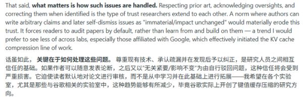 按照 TurboQuant 团队的逻辑,他们的主要贡献在于压缩质量的权衡,而不是具体的加速比,因此就算把和 RaBitQ 的速度对比全删了,也不影响论文的科学价值。评论区质疑如果不重要,当初又何必处心积虑地搞出一套不对等的硬件测试,并把「速度碾压对手」的结论堂而皇之地写进论文里呢?