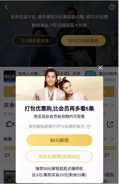 原来,由于电视剧热播,爱奇艺和腾讯视频联合宣布,《庆余年》在12月11日开启超前点播,在用户已是会员的基础上,VIP会员还需花50元,才能在每个更新日比会员多看6集。