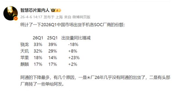 这不行业人士“智慧芯片案内人”就在4月6日给出了一份数据,这个数据展示的就是2026年第一季度国四家处理器在国内的出货量排名情况。获得冠军的是高通骁龙,市场份额为33%,但是同比份额减少了6个百分点,出货量下降18%;排名第二的是联发科,市场份额为32%,同比份额增加3个百分点,出货量增长8%;排名第三的是苹果,市场份额为18%,同比份额增加四个百分点,出货量增长23%;排名第四的是华为麒麟,市场份额为17%,同比份额是持平的,但同比出货量增长2%。