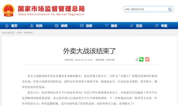 2026年3月,市场监管总局明确释放信号,直指外卖行业内卷式竞争,强调外卖大战该结束了,并启动外卖平台竞争状况调查评估,推动行业转向品质与合规竞争。