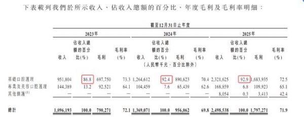 2023年~2025年,基础口腔护理收入分别为9.52亿元、12.65亿元、23.22亿元,占比分别为86.8%、92.4%、92.9%。