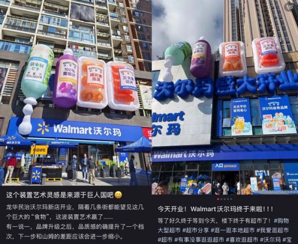 随后几个月,位于深圳龙华ico、世纪春城等地的沃尔玛门口,均出现四个巨型装置,形象分别是沃集鲜的4.0纯牛奶、葡萄汁、咸奶油泡芙和三文鱼切片,由于视觉上太过震撼,又被网友戏称为“沃尔玛四大门神”。