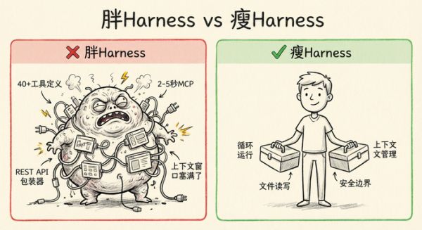 什么叫胖 Harness?你在 MCP 协议里塞了 40 多个工具定义,上下文窗口被占满,每次调用工具要等 2-5 秒。模型的大部分注意力花在理解工具定义上,而不是做正事。