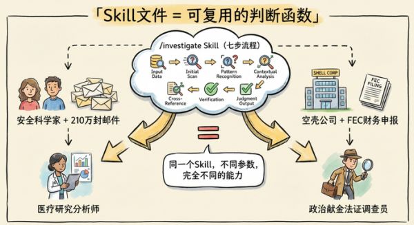 传入「一个安全科学家」+「210 万封发现邮件」→ 模型变成医疗研究分析师传入「一家空壳公司」+「FEC 财务申报」→ 模型变成政治献金法证调查员同一个 Skill,参数不同,能力完全不同。