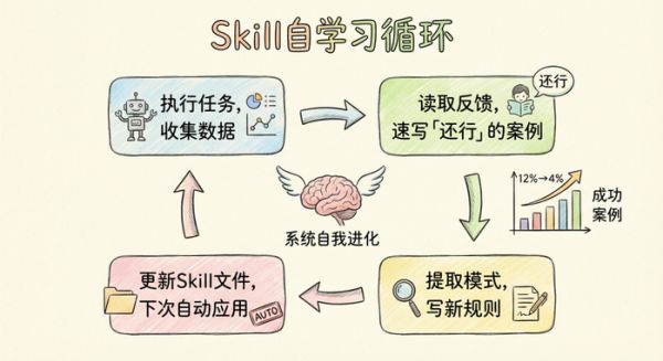 系统还会自我进化。/improve Skill 读取每次活动的 NPS 调查,专门速写那些评价「还行」的反馈——不是「差」,是「几乎成功但没成」的案例。提取规律,写新规则,更新回 Skill 文件。