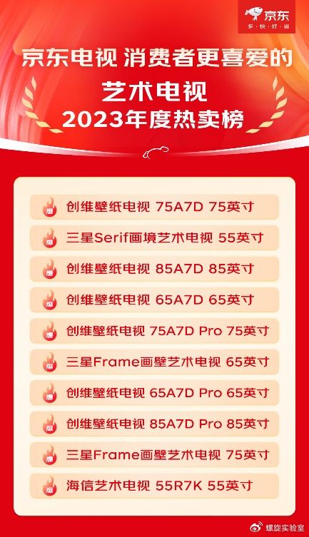 在渠道层面,当时的三星家电也表现得较为积极,线下借着三星手机重新在一线市场布点的契机,三星冰箱和洗衣机业务也开始进入北上广深的一些门店。而在线上,三星与京东合作发展了艺术电视类目,2023年双十一期间,京东艺术电视热销榜TOP10中,三星有三款产品上榜。