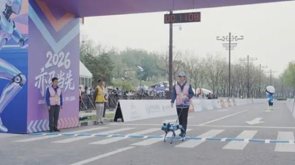 绿灯亮起,机器狗迈步,通过身上牵引绳传导,提示身后的主人跟上——那是一位视障大学生。