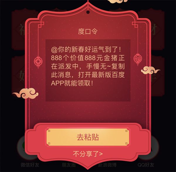 最后百度借鉴了淘宝、支付宝的做法,生成“度口令”,贴到百度APP上就能自动进入活动界面,但操作起来始终不方便,效果肯定大打折扣。。
