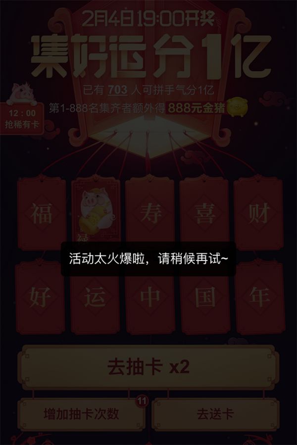 不仅如此,百度在这类型大活动上,似乎存在很多技术上的问题,在活动页面抽卡很容易失败,基本上点击两三次才有反映,提示“活动太火爆啦,请稍后再试~”。看来BAT三大互联网公司,百度的社交属性变得越来越糟糕了,连个活动都做不好。