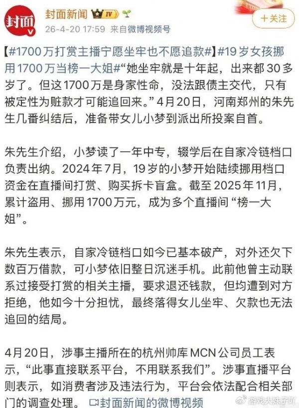 19岁女孩挪用公款,1700万打赏给主播,宁愿坐牢30年也不愿意追回