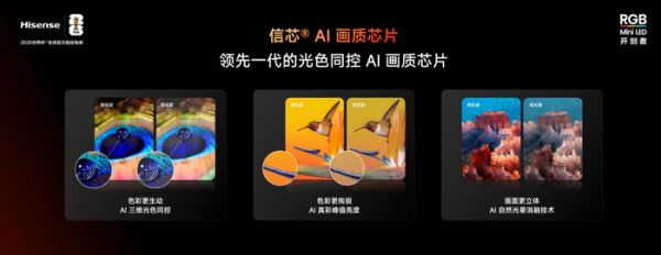 海信解决这个问题的方式是自研芯片。乾照光电提供的车规级9晶RGB发光芯片,配合海信自研的信芯AI画质芯片,实现了“三维光色同控”。简单说,传统方案是“先控光再调色”,RGB-Mini LED方案可以同时独立调控每个背光分区里红、绿、蓝三色芯片的亮度和色彩,这让“1区控色>3区控光”成为可能。