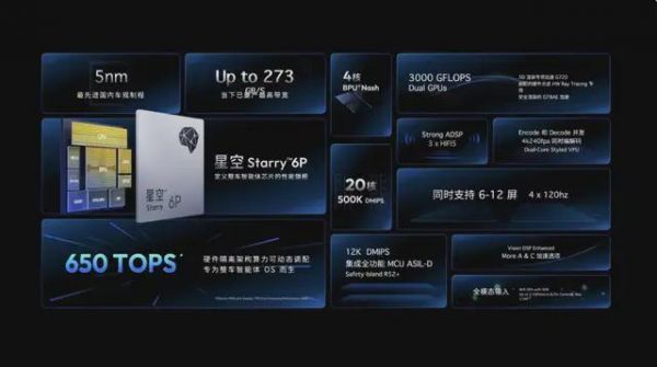 不同的是,地平线 “星空” 采用的是地平线已经大规模量产验证的 BPU(AI 加速器)架构,从智驾向座舱融合。“星空” 包括 6P 和 6H 两款产品,最高算力 650 TOPS,内存带宽 273 GB/s,可同时支持 6-12 屏渲染,还能支持 AI 大模型的本地化部署。