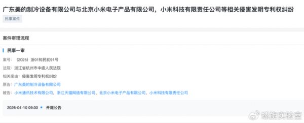 2026年4月10日,杭州市中级人民法院一则开庭公告显示,美的对小米的第四起发明专利侵权诉讼正式开庭。值得注意的是,以上四起诉讼的案件编号是四个“连号”,被起诉的除了小米旗下子公司,还包括电商渠道天猫背后的浙江天猫网络有限公司,形成了一个完整的诉讼矩阵。