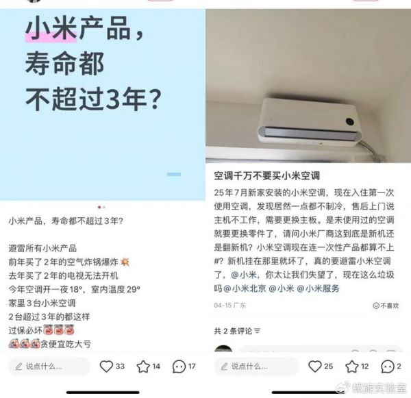 在社交平台上,投诉小米家电的帖子也比比皆是,不少消费者吐槽小米家电容易坏、熬不过三年等。