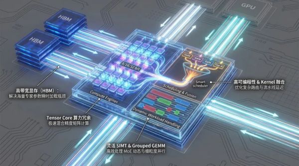此次适配中,天数智芯与DeepLink团队聚焦DeepSeek-V4核心技术特性,针对MoE架构、稀疏注意力、FP8混合精度等关键模块,依托KernelSwift开展定制化算子开发与深度优化。双方技术团队协同攻坚,充分发挥天数智芯芯片产品的算力密度、带宽优势,以及低时延、高吞吐推理能力,实现模型发布与算力资源适配同步落地。