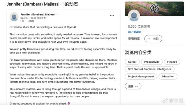 值得一提的是,市场推广负责人Majlessi曾在领英上公开宣布自己离开Salesforce、加入OpenAI的消息。“对我而言,这次机会意义非凡,因为我真心相信这款产品——我亲眼见证了这项技术在工作和生活中的实用价值。”她在文中写道。