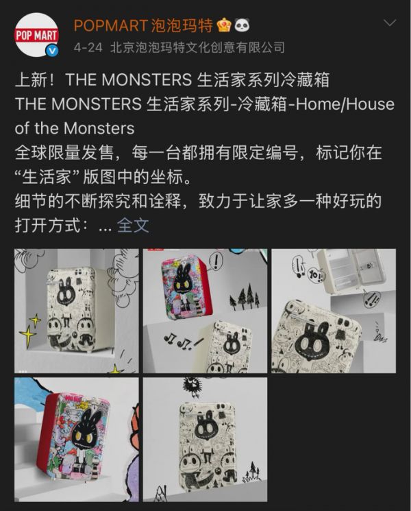 近日,泡泡玛特在社交平台正式发布了首款家电产品THE MONSTERS生活家系列冷藏箱(以下简称LABUBU冰箱),并宣布将于4月30日22点正式发售。