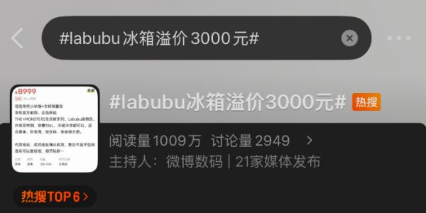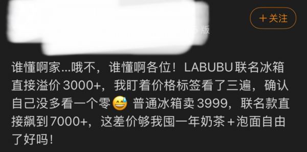 4月27日下午,“LABUBU冰箱溢价3000元”的词条飙上微博热搜榜前列,引发网友热议。