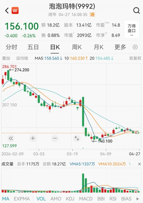 二级市场方面,泡泡玛特近三个月股价累计下跌超27%。截至4月27日收盘,泡泡玛特报156.1港元/股,最新市值为2093亿港元。