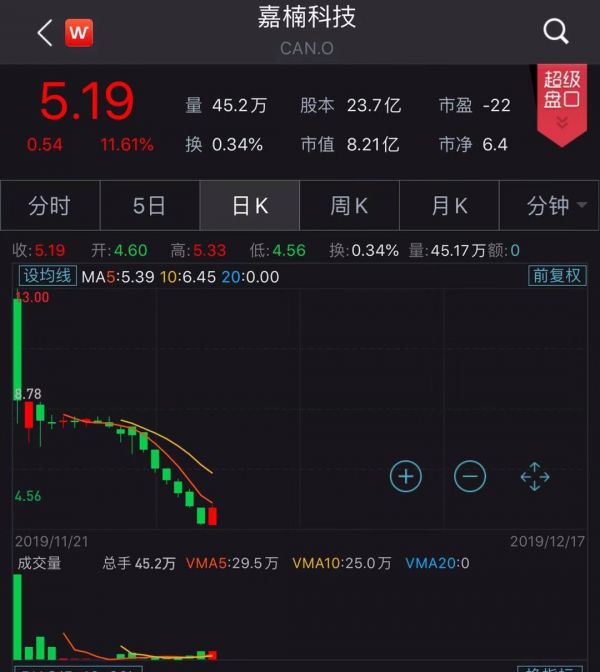 在首个交易日以8.99美元破发后,嘉楠科技价格在8美元以上波动,美国时间12月3日后价格一路下挫。截至美股周二收盘,嘉楠科技股价为5.19美元,较周一提高11.61%。但与9美元的发行价相比,降低42.3%,总市值为8.21亿美元。