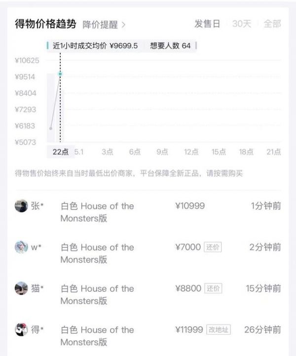 官方渠道“秒没”,二手市场却迅速热闹起来。记者注意到,已有其他平台迅速出现二手交易链接和溢价交易。其中得物平台在晚上10点01分,出现一单成交价为11999元的白色LABUBU冰箱的交易,溢价6000元;晚上10点14分,再次出现一单8800元的白色LABUBU冰箱的“还价”交易。淘宝平台上,也有潮玩店铺以8309.9元和8909.9元的价格售卖白色LABUBU冰箱和红色LABUBU冰箱,截至记者发稿,显示已销售7件。