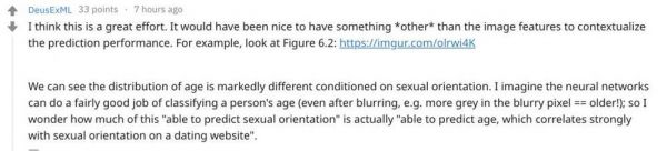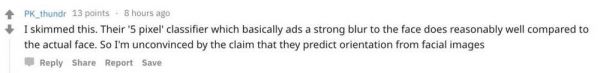 如 Reddit 用户 PK_thundr 浏览完文章表示,“他们的‘5 像素’分类器对高度模糊面部的判断几乎和实际面部一样好。所以,我并不信服从面部图像预测性取向的结论。”