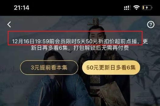 有用户表示自己的权益缩水。在限时折扣的那几天中,50元的价格可以一路提前观看,解锁至大结局,而错过50元想要提前点播的,则要花费75元。观看剧的过程中,还有时间限制,会员一旦过期就再也无法观看。