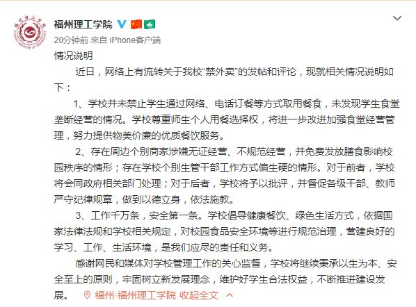 新京报快讯 今日(21日),福州理工学院就网络上有流传关于学校“禁外卖”的发帖和评论发表情况说明。