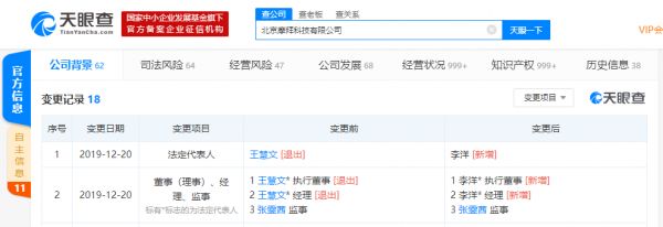 网易科技讯 12月22日消息,天眼查数据显示,12月20日,北京摩拜科技有限公司发生工商变更,美团联合创始人、高级副总裁王慧文卸任公司法定代表人、执行董事和经理一职,由美团点评高级副总裁李洋接任。