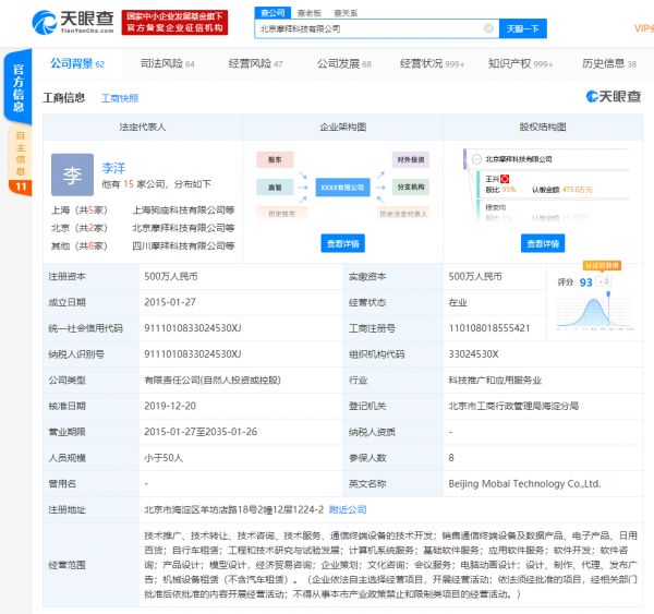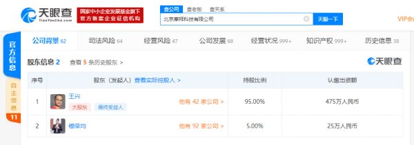 北京摩拜科技有限公司成立于2015年1月,注册资本500万人民币,经营范围包括自行车租赁、机械设备租赁(不含汽车租赁)、工程和技术研究与试验发展、基础软件服务等。公司大股东为王兴本人,持股比例为95%。