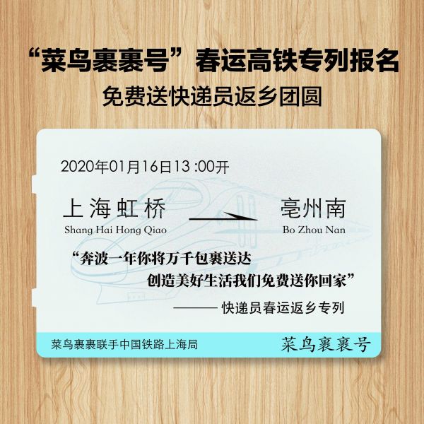 12月24日,菜鸟裹裹宣布,与中国铁路上海局集团有限公司合作,将于2019年1月16日,即小年夜的前一天,开通快递员春运高铁专列送快递员返乡,具体线路为上海往安徽方向。