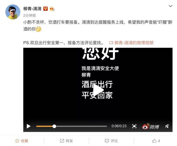 网易科技讯12月24日消息,今日,滴滴总裁柳青在其个人微博上透露自己录制的一段语音将要在平安夜上线,提醒饮酒用户在“双旦”节期间别忘了报备,“希望我的声音能‘吓醒’醉酒的你。”
