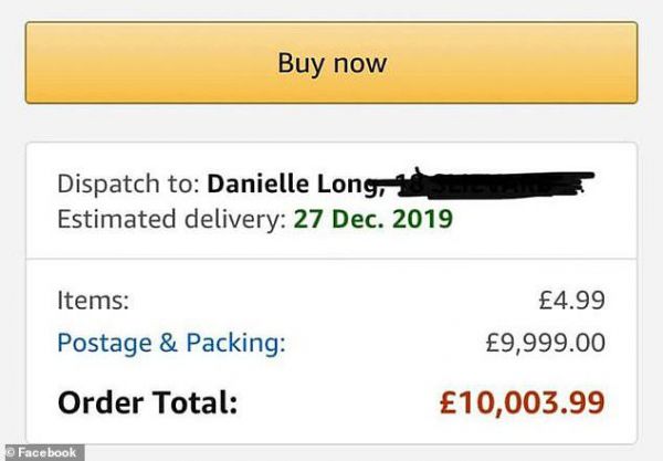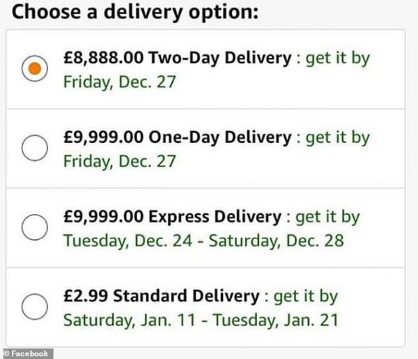 这位女子名为丹妮尔·朗,家住北爱尔兰卡里克弗格斯。英国《每日邮报》23日报道,她打算从亚马逊网站购买一个可以放在床头的手机、平板电脑收纳袋,网站售价4.99英镑(45.3元人民币)。但她在选择收货时间时发现,网站的“一日送达”和“快速配送”收费均为9999英镑,且不能保证在圣诞节当天送到;“两日送达”快递费稍微便宜一点,但也要8888英镑(8万元人民币),且只能保证在本月27日前送到。如果只想支付2.99英镑的普通送货费,则收货时间在明年1月11日至21日之间。依照《每日邮报》说法,这似乎更像是系统出现了错误。