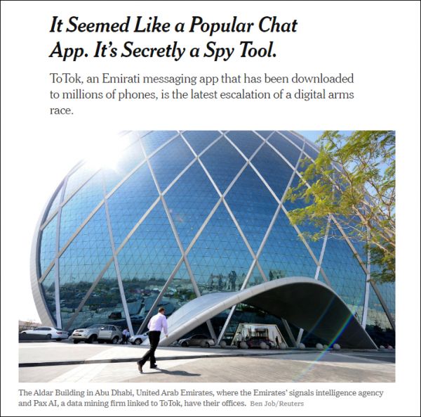 22日,《纽约时报》发布题为《它看起来像是一款流行的聊天应用,暗地里却是个间谍工具》的文章。其中指出,来自阿联酋的聊天应用软件“ToTok”,被宣传是通过视频或短信的形式,与朋友家人进行聊天的一款简单又安全的软件。