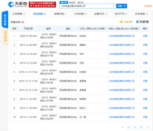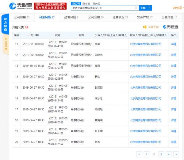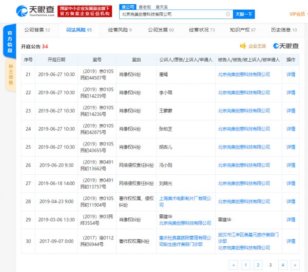 网易科技讯 12月26日消息,天眼查数据显示,近日,互联网医美平台更美APP的运营主体北京完美创意科技有限公司遭马苏、王欧、刘诗施(刘诗诗)、李易峰、张雨绮、张艺兴、王一博、秦岚等多位明星起诉,案由均为网络侵权责任纠纷。除此以外,2019年以来,北京完美创意科技有限公司还曾遭唐嫣、冯小刚、张柏芝、靳东、黄晓明、李小璐等多位明星起诉,案由包括肖像权纠纷和网络侵权责任纠纷。