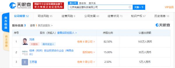 公司共有三位股东,其中大股东为公司创始人兼CEO刘迪,持股比例为82.50%,第二大股东为经纬中国的投资实体之一经纬(杭州)创业投资合伙企业(有限合伙),持股比例为15%,第三大股东为公司联合创始人兼COO王思璟,持股比例为2.50%。