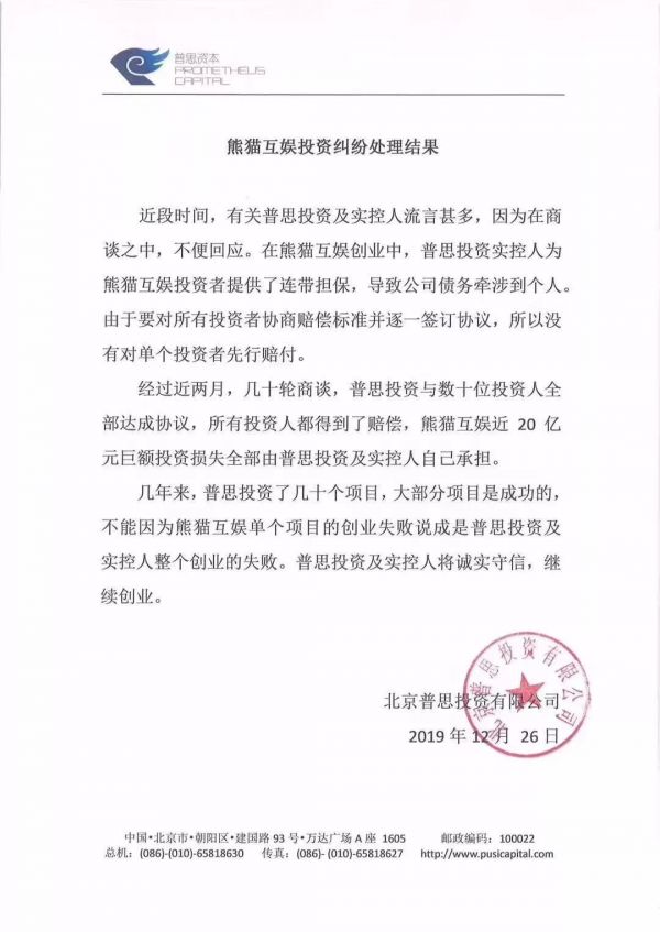 今日,普思资本发布熊猫互娱投资纠纷处理结果,经过近两月,几十轮商谈,普思投资与数十位投资人全部达成协议,所有投资人都得到了赔偿,熊猫互娱近20亿元巨额投资损失全部由普思投资及实控人自己承担。