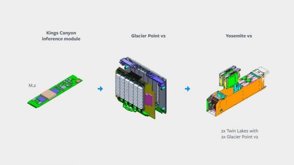 每个 Kings Canyon 模块都包含 ASIC、相关内存和其它支持组件,其中 CPU 主机通过 PCIe 通道与加速器模块通信。Glacier Point v2 包括一个集成的 PCIe 交换机,允许服务器同时访问所有模块。