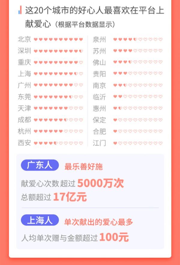 水滴筹年度爱心数据显示,广东、浙江、江苏、山东、四川、河南、福建、湖南、河北、北京这十个省份是最乐善好施的省份,而以城市维度,北京、深圳、重庆、上海、广州、东莞、天津、成都、杭州、西安、泉州、苏州、佛山、贵阳、南京、临沂、惠州、保定、合肥、江门这二十个城市爱心救助人次排在前列。