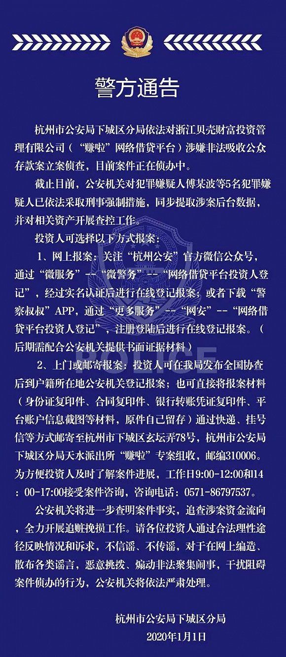 1月1日,杭州市公安局下城区分局通过官方微信公众号“下城警事”发布了关于浙江贝壳财富投资管理有限公司(下称贝壳财富)涉嫌非法吸收公众存款案的案情通报。