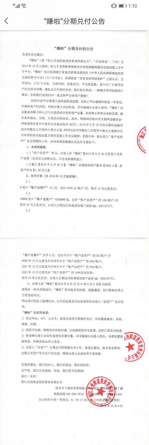 2019年10月,贝壳财富宣布“良性退出”。其运营的“赚啦理财”APP发布分期兑付公告,宣布由于平台遭受大面积借款端逾期,决定全面停止所有业务的发展,做出良性退出,分批、分期兑换的决定,涉及用户数4884人,总资产约1.66亿元。赚啦理财此次分期兑换分为三个方案,账户总资产少于1万元的,每个账户每月可兑换5000元;账户总资产大于1万小于5万的,每个月兑换账户总资产的10%;账户总资产大于5万的,每个月兑付总资产的2%左右,最晚2022年10月完成全部兑换。