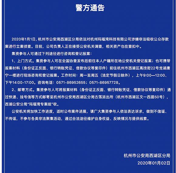 1月2日,杭州市公安局西湖分局官方微信发布警方通报称,已在1月1日对杭州玛瑙湾科技有限公司(下称玛瑙湾)以涉嫌非法吸收公众存款案立案侦查。目前,公司负责人正在接受公安机关调查,相关资产也在查扣中。