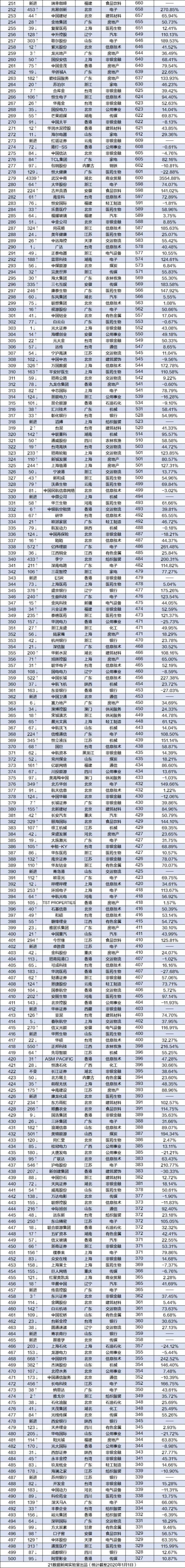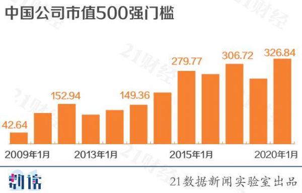 市值500强门槛再创新高。数据显示,本次500强榜单入围门槛326.84亿元,相比前一年提高77亿元。“守门员”为阿里影业(1060.HK),尽管市值增长10.87%,名次却下滑了95名,徘徊在榜单的边缘。