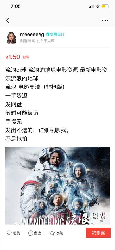 有多名网友回复国家版权局微博,称在闲鱼平台发现大量《流浪地球》盗版资源售卖。网友“光宝酱”说:闲鱼上面就好多盗版,举报不过来。