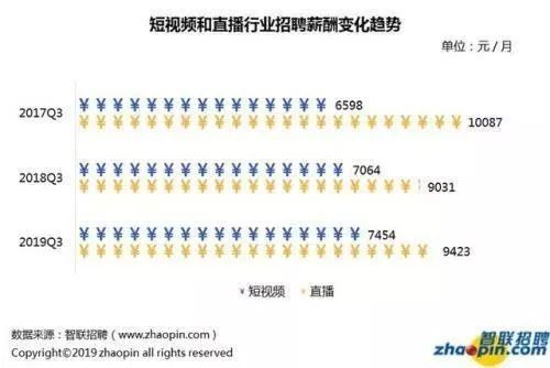 近日,某招聘网站发布了《 2019年短视频/直播行业人才发展报告》,报告显示2019年三季度,直播的平均薪酬为9423元/月,短视频为7454元/月。